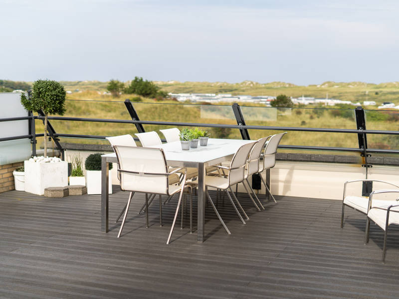 In the utility room, behind the open kitchen, is a washing machine and dryer. There is also a separate toilet on the living floor. The roof terrace of 50 square meters is accessible from the living room and there are garden chairs, a garden table and two sun loungers.