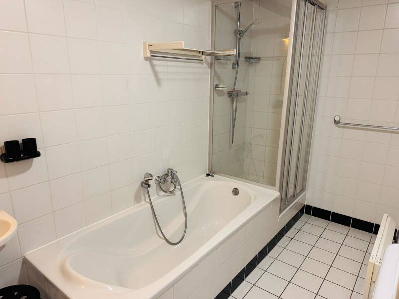 Het totale appartement beslaat ongeveer 85 vierkante meter en heeft een badkamer met daarin een aparte douchecabine, een ligbad en een wastafel.
