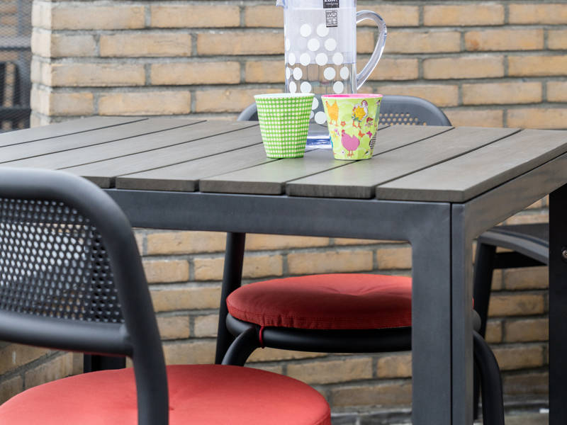 Großzügiger, sonniger und überdachter Balkon mit bequemen Gartenstühlen, einem Esstisch und mit Hilfe von Kunstpflanzen gemütlich gemacht.